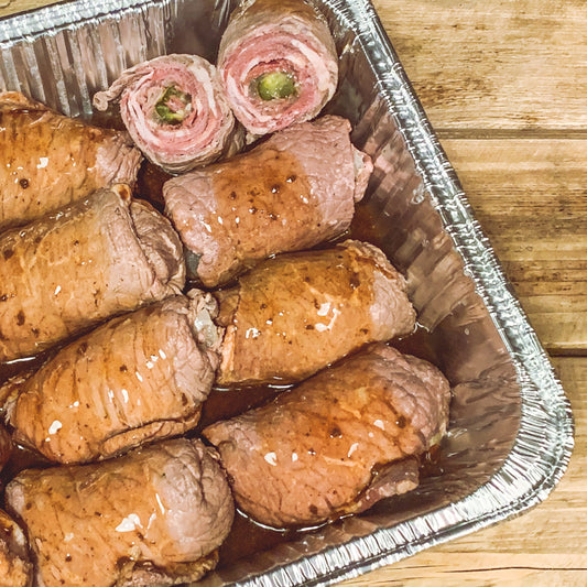 Classic German dish of thin steak rolled with mustard, bacon, pickle & onion and served with a rich gravy.Add to Quote QuantitySM (serves 12)